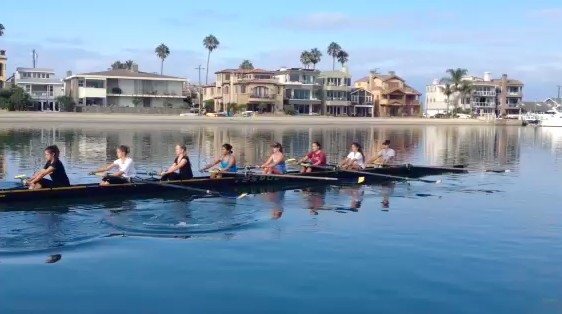 (Left to right) Sydney Abad, Kelsey Davis, Alexandra Savage, Cecilia Guerrero, Rikki Oden, Maria Guardiola, Ariana Gastelum and Penelope Gallardo along with coxswain Sarah Dresser (not pictured) did a series of pieces targeted to improve squaring up early, control of power and timing among each pair.