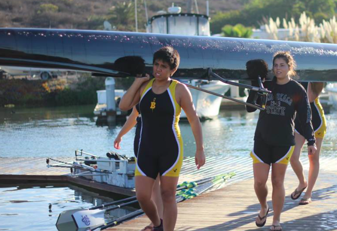 Varsity rowers Cecilia Guerrero and Ariana Gastelum finish the Newport Chase in November 2014.
