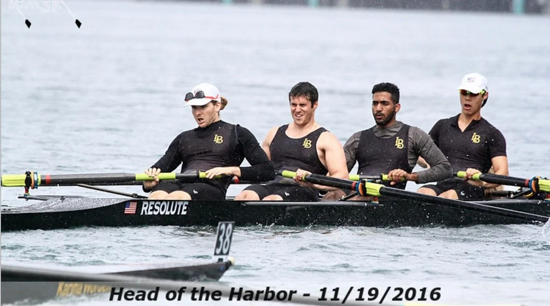 Head of the Harbor about is about as straight of a course as it gets for head racing, and the distance is around 4800 meters. 1500 meters into the race Santa Barbara is closing in on us like they were shot out of a cannon. Their bow ball is on our stern deck and I can hear their coxswain calling power fives and demanding her rowers to bring up the power to pass us. Had I moved my eyes to left a millimeter I would have been able to tell you the color of her eyes, but by this time in the race I was seeing tunnel vision. I knew that I could not afford to take one stroke off or I run the risk of letting down my teammates behind me who are all working just as hard, if not harder than I to not let this boat physically pass us. We counter every attempt to pass by Santa Barbara by powering up with them, their coxswain is getting frustrated. This is a battle of will, determination, and effort, and it goes on for roughly 12 minutes. With 1000 meters to go we close in on USC and San Diego State, who were both sent off before us. I can now hear USC's coxswain, Santa Barbara's coxswain, our coxswain, Nikki Jenkins, and our teammates and friends screaming "GOOO BEEAACCCHH!!!" from the boat launching dock on the shore to the right. The sound of our 4 oar locks popping together in stereo keeps my breathing rhythm synchronized with each stroke. We bring up the rate and the power and the tunnel I'm looking through is getting smaller and smaller. Pulling away from Santa Barbara and gaining ground on USC with each stroke and my whole body is on fire. We now have overlap with our bow ball on the stern deck of USC. Nate, Dylan, Ibrahim, Nikki, and myself are giving it everything we've got, this is the last competitive collegiate race Nate and Dylan will ever have and we are not about to give up anything! Nikki calls another power 10 and we fly across the finish line on the last strokes, simultaneously running completely out of energy. We held our ground.