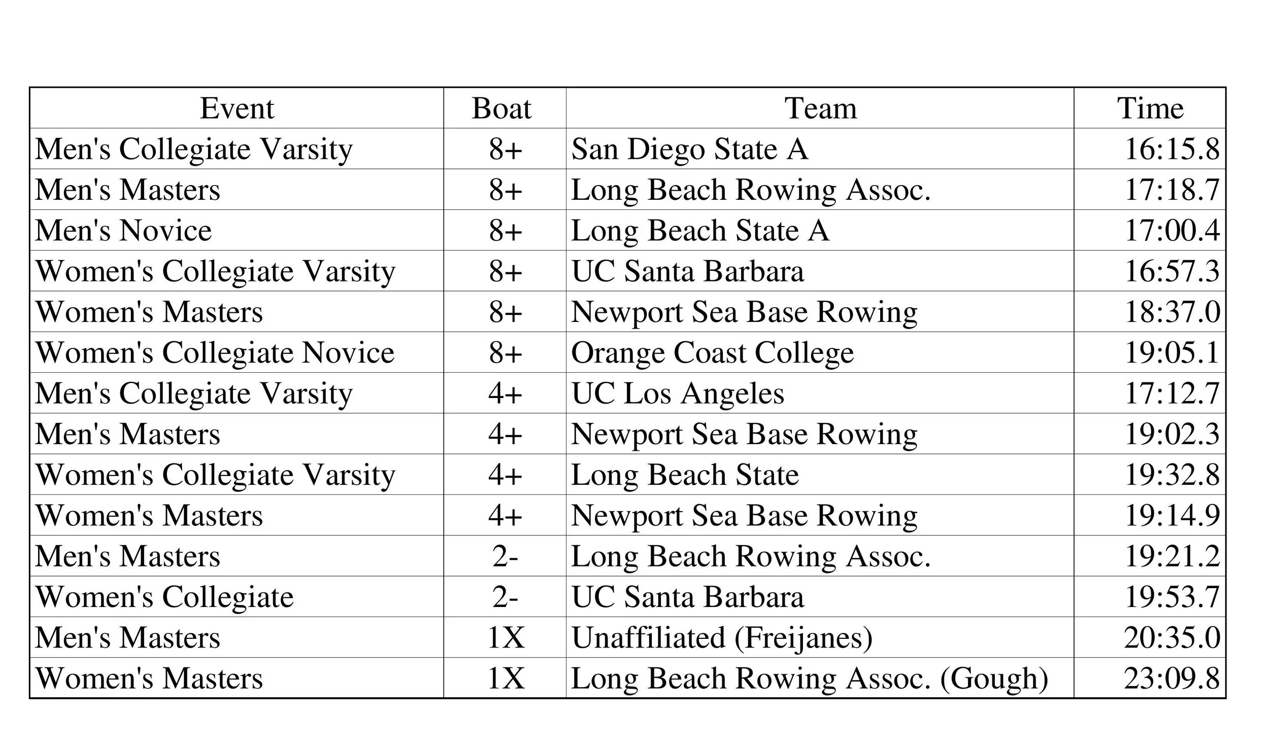 The alumni, the Queen Mary, the Seal Beach Lion's Club, the Long Beach Yacht Club, the Alamitos Bay Yacht Club, the City of Long Beach, the Long Beach Aquatic Capital of America, the Long Beach Rowing Association, our Southwest Region USRowing referees, and last but not least the many volunteers, were involved in the preparation of this year's regatta (apologies if you were not listed). Thank you everyone!