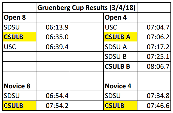For many of the Novice, this season's Gruenberg cup was their first regatta. Beach Crew placed second in all of the heats, closing in and defeating USC in the final few hundred meters of the Open 8 event and coming very close to first place in the Open 4 heat. Overall, the regatta showcased the work that was being put in by our athletes, as well as the potential for so much more. Hearing the closeness of the opposing coxswain's calls, feeling the rush that accompanies walking on and eventually passing the opponent's boat, and finally going home knowing that all was given on the water is what drives rowers to spend hours training and developing their physical fitness and skill.