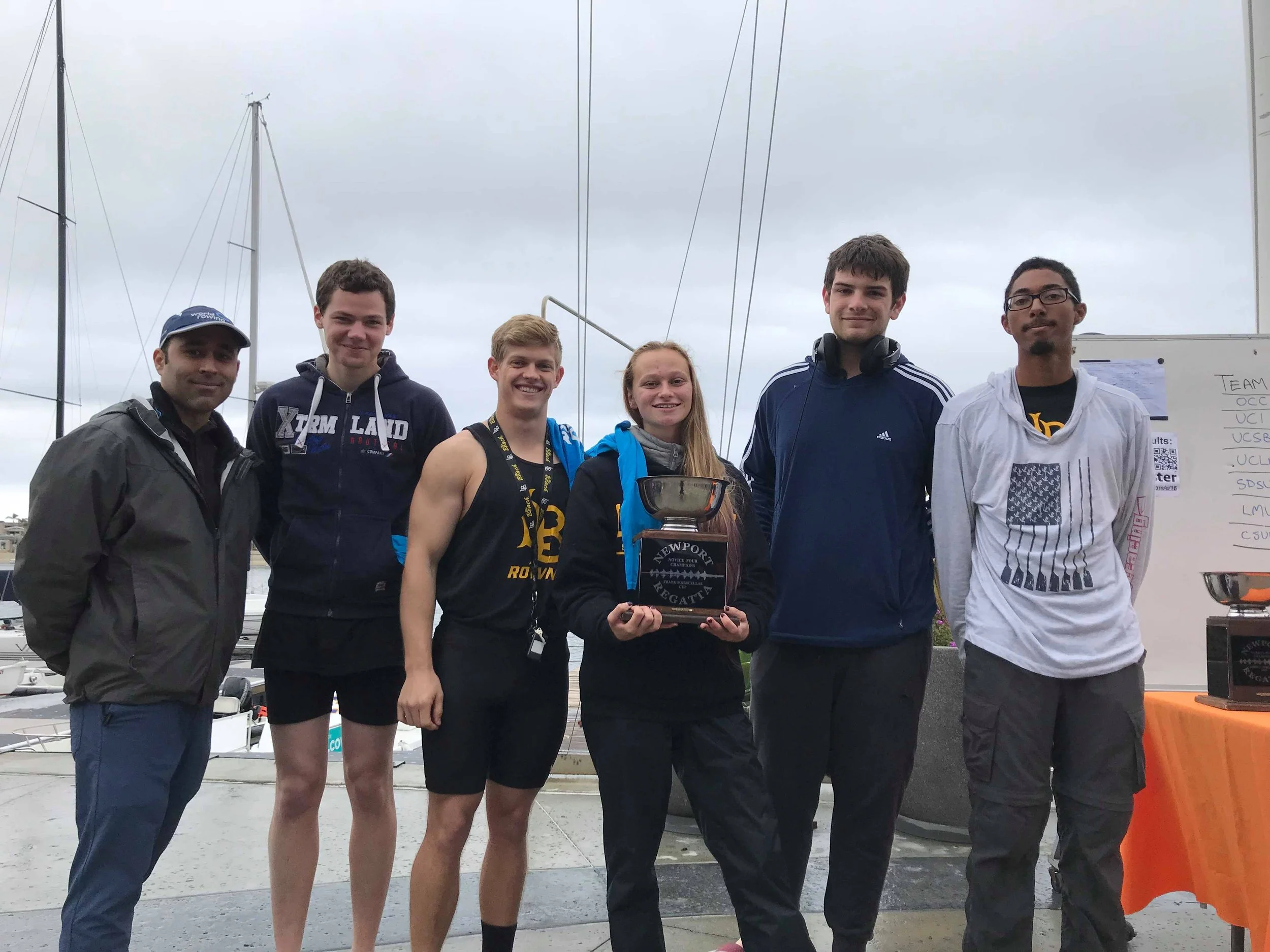 Head Coach AC Chacon with the Novice 4+ with their trophy, medals, and shirts. Left to right: AC Chacon, Arthur Parmentier, Clay Harshman, Phoebe Evans, AJ Ruger, Sean Thenard