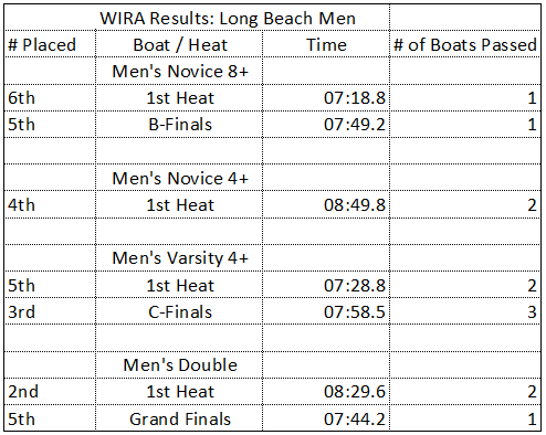 Held every year around the same time, this year's Western Intercollegiate Rowing Championships, also simply known as WIRA, took place on the last weekend of April (4/28-4/30) at the Sacramento State Aquatic Center. This regatta featured pairs and doubles in addition to the standard 8+s and 4+s featured in just about every regatta. Being the last major and official regatta for most of the collegiate crews on this side of the country, coaches planned for the crews to peak in their training around this time; thus, it is usually the most competitive out of all of the regattas that Beach Crew partakes in. This year, novice and varsity captains from the Men's team were chosen to lead second workouts on top of the standard 5:30 AM practice, with most of the athletes ending up getting two workouts a day, multiple days a week. The women's team went through similar feats to prepare for competition as well, feats that required much self-discipline.
